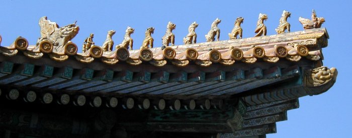 Noget af det mest spændende i Den Forbudte By er efter min mening de utroligt smukke tage med de spændende dekorationer. Formålet med disse dekorationer, som består af et dyremenageri, er at beskytte paladset og dets beboere mod fare. Jo vigtigere paladset var, jo flere figurer indgår i dekorationen. Figurerne er enten udskårne eller lavet i gul, glasseret sten.