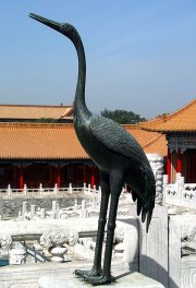 Verandaen er flankeret af bronzefigurer af traner og skildpadder. Ifølge traditionel visdom var "de himmelske traner", "tian-he" eller "de velsignede traner", "xian-he" budbringere af visdom. Man mente, at tranen kunne blive mere end 1000 år gammel. I Ming-perioden var tranen symbolet for rigets højest placerede embedsmænd. I mange kinesiske eventyr bliver såkaldt "udødelige" transporteret på ryggen af traner, når de besøger den jordiske verden.