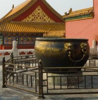De mange store forgyldte bronzekar (der skulle være 308 i alt), som man møder overalt, tjente som brandspande, idet Den Forbudte By ofte var hærget af brande. De store brandspande vejede 4 tons og kunne rumme 4000 liter vand. Om vinteren, hvor der er bidende koldt, blev der lagt et låg over karret og om nødvendigt fyret op under karrene for at holde vandet flydende. Da de allierede styrker rykkede ind i Den Forbudte By under den såkaldte bokseropstand, forsøgte de med bajonetterne at skrabe den gyldne belægning af karrene, hvilket de stadig bærer præg af.