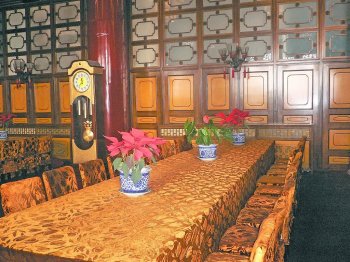 Vi kunne spadsere hele vejen rundt om bygningen på den udvendige balkon. Undervejs fik vi et kig ind i de officielle møderum, som ses nedenfor. I en stor sal kunne man på opstillede TV-skærme se programmer med Kinas historie fra omkring 1910 og til i dag. Det mest fantastiske - for mig - var oplevelsen af at være på et sted, som har haft så stor betydning for Kina og vores verden.