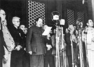 Billedet til højre viser formand Mao, da han den 1, oktober 1949 udråbte Folkerepublikken Kina. Dette skete fra Den Himmelske Freds Port. Som det fremgår af det øverste billede, prydes Tiananmen af et stort portræt af Mao. Det har hængt der siden revolutionen i 1949. På begge sider af portrættet er der inskriptioner, til venstre: "Længe leve Folketrepublikken Kina", mens inskriptionen til højre siger: "Længe leve den store enighed mellem verdens folkeslag". Under de prodemokratiske demonstrationer i 1989 kastede arbejdere fra Maos hjemprovins, Hunan æg og maling på formandens portræt. Heldigvis havde kommunistpartiet et lager af Mao billeder, så der gik kun ganske kort tid, inden et nyt var hængt op. Forsiden af Tiananmen er kraftigt oplyst om aftenen og om natten.