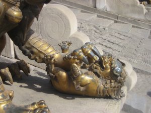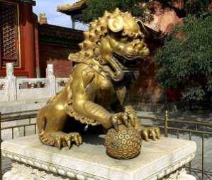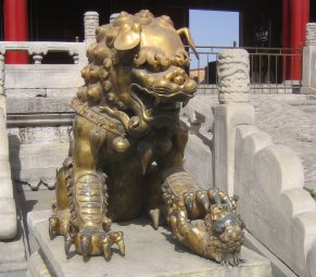 Det vrimler med løver i Beijing, fx har officielle bygninger samt større hoteller og restaurationer ofte et løvepar siddende ved indgangen. Deres opgave er at beskytte bygningen og dens beboere. Løverne i Den Forbudte By er selvfølgelig større og mere frygtindgydende end de hundelignende løver, der stod udenfor vores hotel, men de skulle selvfølgelig også vogte den kejserlige familie. Der er vel ikke noget at sige til, at dyrenes konge skulle fungere som vagthund for Himlens Søn, en tradition siden Han-dynastiet (206 BC-220 AD).
