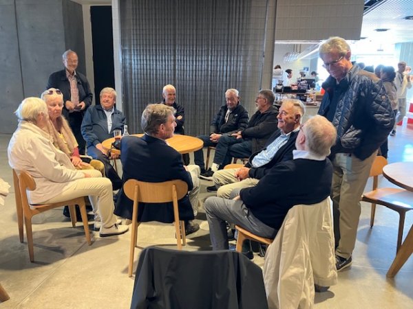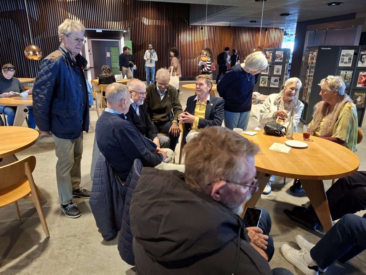 Omkring kl. 12 forsamledes vi i cafeen på DOKK1, Aarhus' nye bibliotek og kulturhus. Fra A-klassen deltog Bent Bojesen, Erik Ebbesen, Lars Sunn Pedersen, Mogens Nielsen og Per Lysdahl. Liselotte havde desværre ikke reageret på invitationen, men vi håber, at hun dukker op næste gang. Ebbe havde pga. et arbejdsmøde måttet melde fra til sejlturen, men han ville slutte sig til os på Teater Bodega. Ebbe er formentlig den eneste af os, som for længst har passeret "støvets år", der stadig har et arbejde. Fra B-klassen deltog Aksel Schjødt, Hanne Vestergaard Billund, Ib Kjærgaard, Ingelise Søndergaard Jensen, Klaus Møller, Louis Rolander, Peter Klingsten, Søren Sørensen og Vibeke Hvidtfeldt. Tove havde desværre måttet melde fra pga. helbredsproblemer. Det er første gang, Tove ikke har været med. Vi sender hende alle en kærlig hilsen og håber at se hende næste gang.