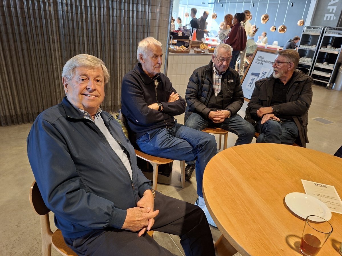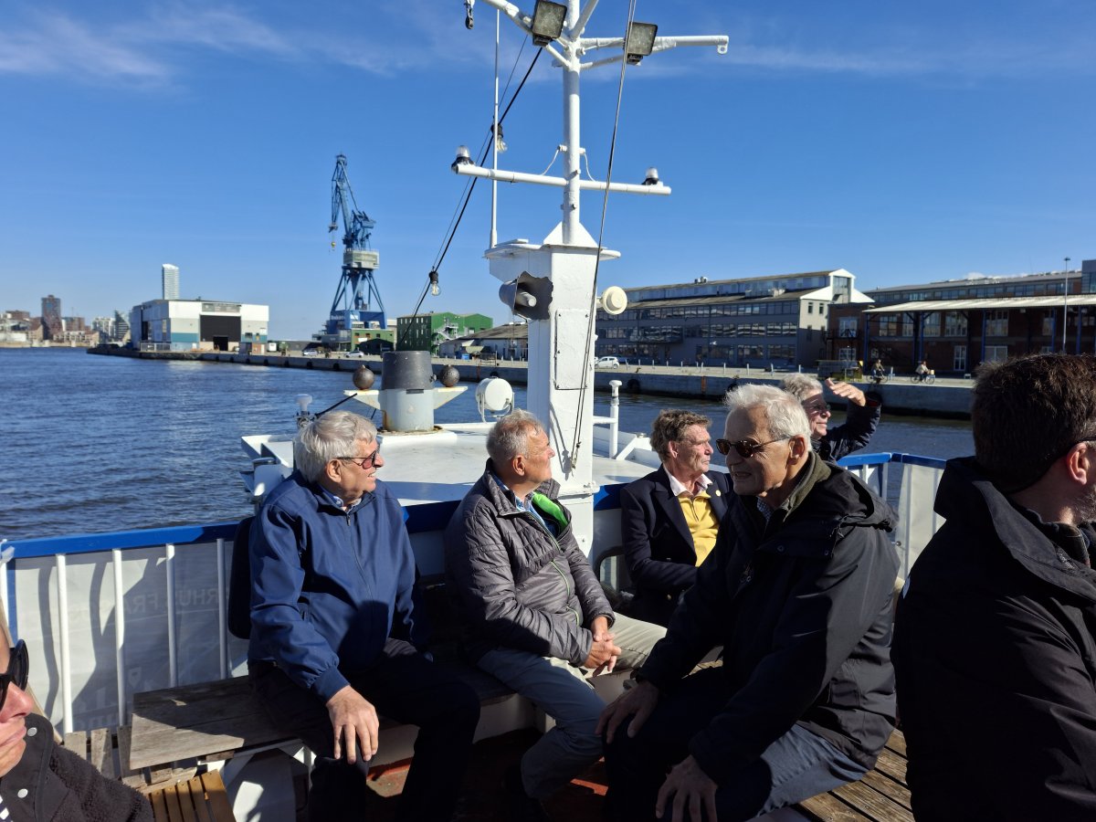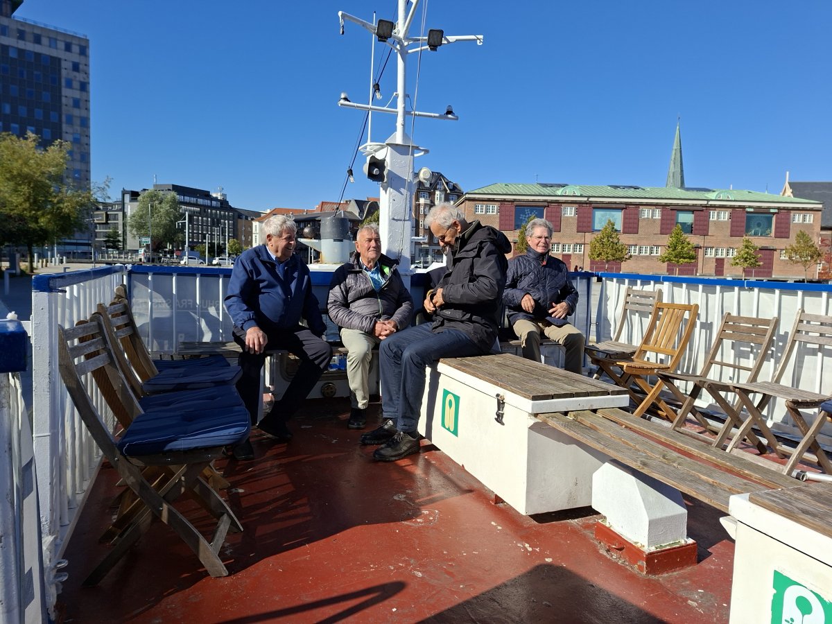 Her ses kammeraterne fra A-klassen: Lars (AKA Las), Per, Bent (Boj) og Mogens (Mus). Selv om Las har boet på Aarhus Ø i en årrække, var det første gang, han skulle havnerundfart. Las, Boj, Mus og jeg samt vores familier har faktisk været venner, siden vi forlod skolen for 65 år siden.