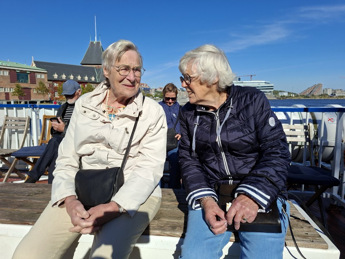 Og her har vi Vibeke og Ingelise. Jeg ved ikke, om jeg i disse mee-too tider tør mene, at de egentlig har klaret de 65 år, siden vi forlod skolen, meget godt. Nej, jeg må hellere holde min mund. I baggrunden anes Toldboden og længere ude til højre nogle af de ikoniske bygninger, som er opført på havnen de seneste år.