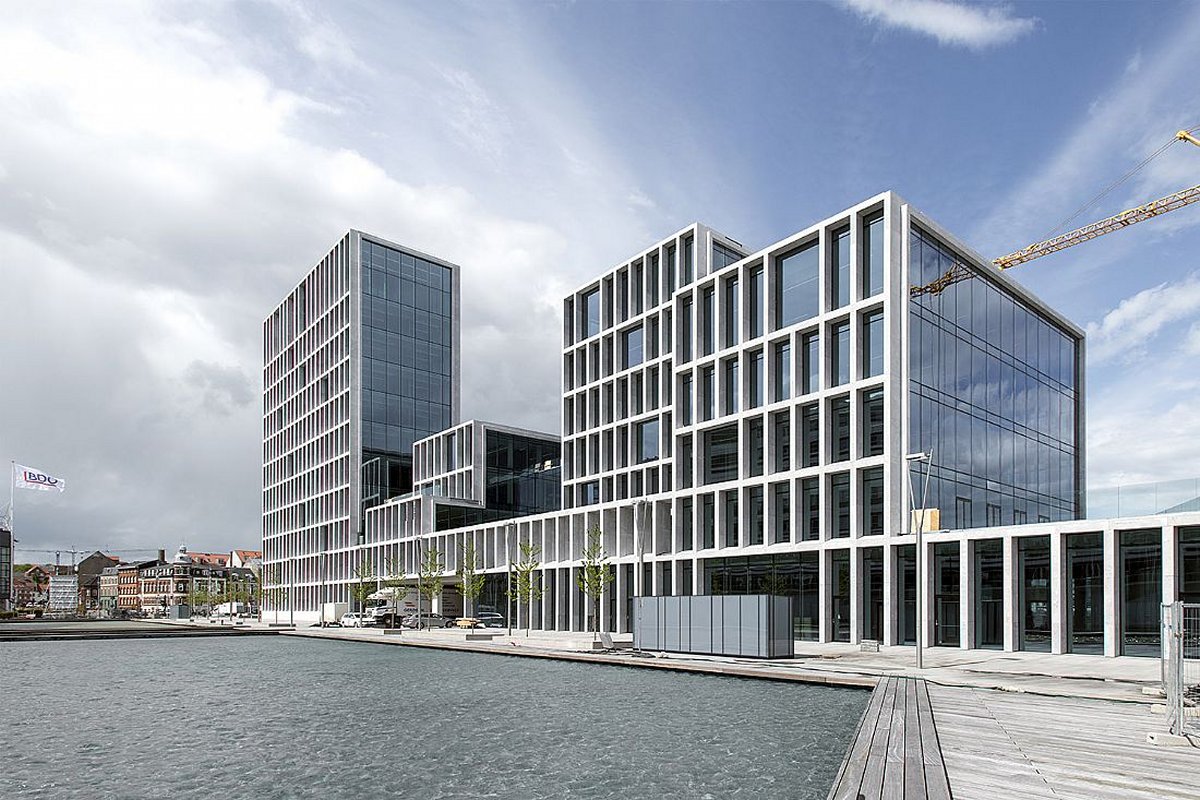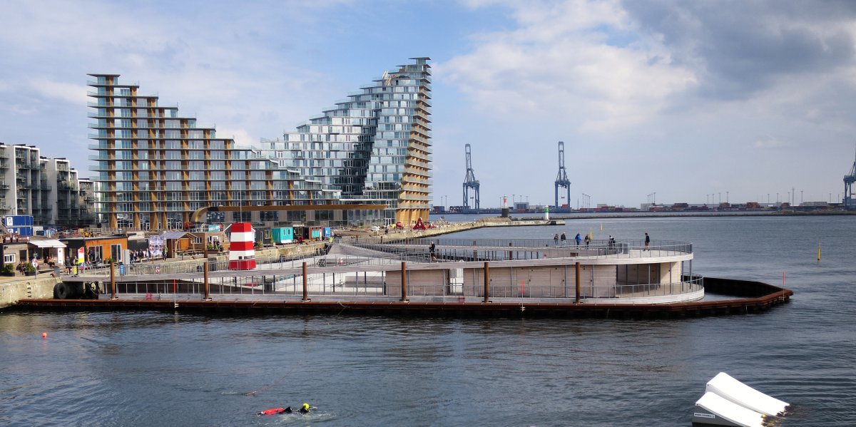 I baggrunden til højre ses AARhus-bygningen, som er tegnet af arkitekfirmet BIG og Gehl Architects. Bygningen rummer 250 luksuslejligheder, men også lejemål til mindre erhverv, et fælleshus og en teaterbygning. Bygningen består af to tårne, der danner en kile væk fra hinanden. Østtårnet er 74 m højt og vesttårnet 52,5 meter. Det samlede projekt er på 43.500 m². Byggeriet rummer også et par cafeer og en restaurant samt nogle badehuse.