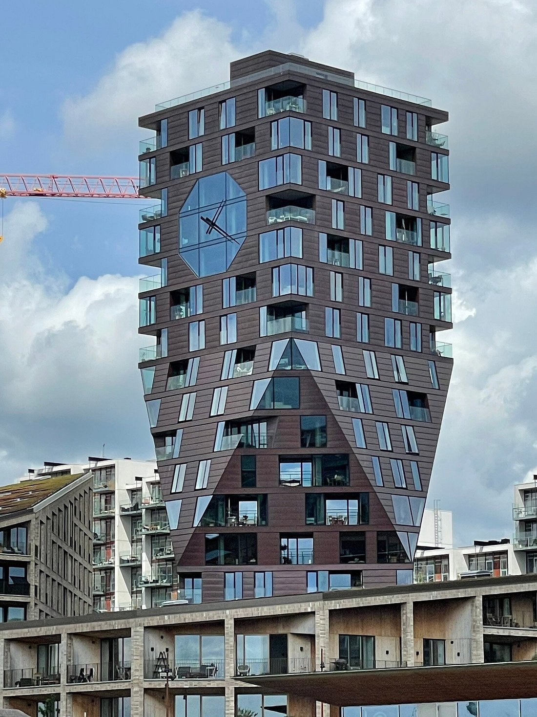 Lars betragter Lighthouse beliggende yderst på Aarhus Ø. Med sin højde på 142 meter er den Danmarks højeste bygning (indtil videre). Den er tegnet af det Aarhus-baserede arkitektfirma 3XN. De første beboere flyttede ind i november 2022. På toppen af højhuset ligger Restaurant Bavn, og her er et udendørs udsigtsområde med adgang for alle (dog mod betaling). I stueplan kan ses udstillingen "Byen & Bugten". I 2023 vandt Lighthouse prisen som verdens flotteste højhus i størrelsen 100-199 meter. Hele vejen omkring Lighthouse løber en promenade, som er tilgængelig for alle. Las og Elin flyttede ind i en lejlighed i Lighthouse for et par år siden. Da vi nærmede os bygningen, kom Elin ud på altanen og vinkede.