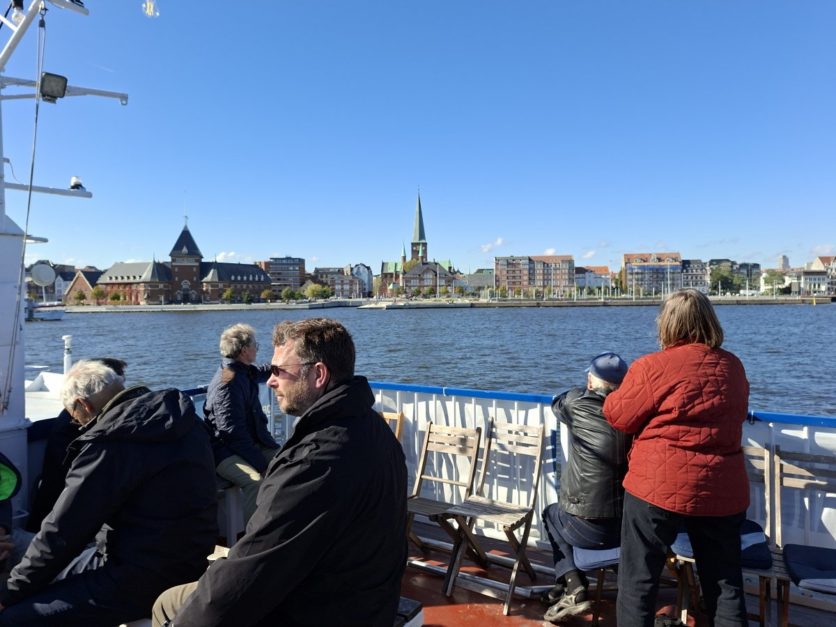 I god tid tog vi opstilling ved Århus Havnerundfart, hvis både lægger til lige nedenfor DOKK1. Aksel og Klaus, som begge for mange år siden emigrerede til Sjælland, havde forvildet sig hen ad Havnegade og var næsten nået hen til domkirken, inden vi fik kontakt med dem og bragt dem tilbage. Ja, de er towlige de køwenhavnere... Vi skulle sejle med skibet til højre, som har plads til passagerer både oppe og nede (inde).