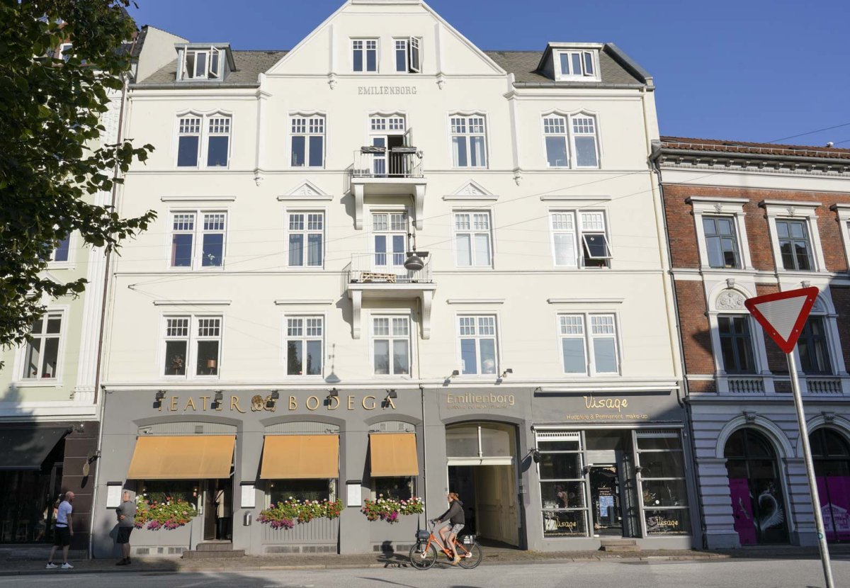 Fra DOKK1 slentrede vi de få hundrede meter hen ad Skolegade (nej, ikke Vestergade) til Teater Bodega. Her var det lykkedes Per Lysdal at skaffe os et lokale for os selv, så vi kunne snakke løs uden at genere hele restauranten. Teater Bodega ligger tæt på domkirken og Aarhus Teater og er et kendt spisested i de aarhusianske kulturelle kredse. Væggene i bodegaen er dækket med utallige signerede billeder af kendte teaterfolk fra ind- og udland og udgør således et stykke dansk teaterhistorie. Fra 1908 lå her et konditori ved navn Emmery. Siden kom en cafe med navnet Torvecafeen. I husker sikkert også, at der i vores barndom var torv med grøntsager på Bispetorvet hver lørdag. I 1959 skiftede restauranten navn til det nuværende Teater Bodega. På det tidspunkt var der en tendens til, at restaurations- og værtshusmiljøet flyttede fra strøgområdet til området ved domkirken.