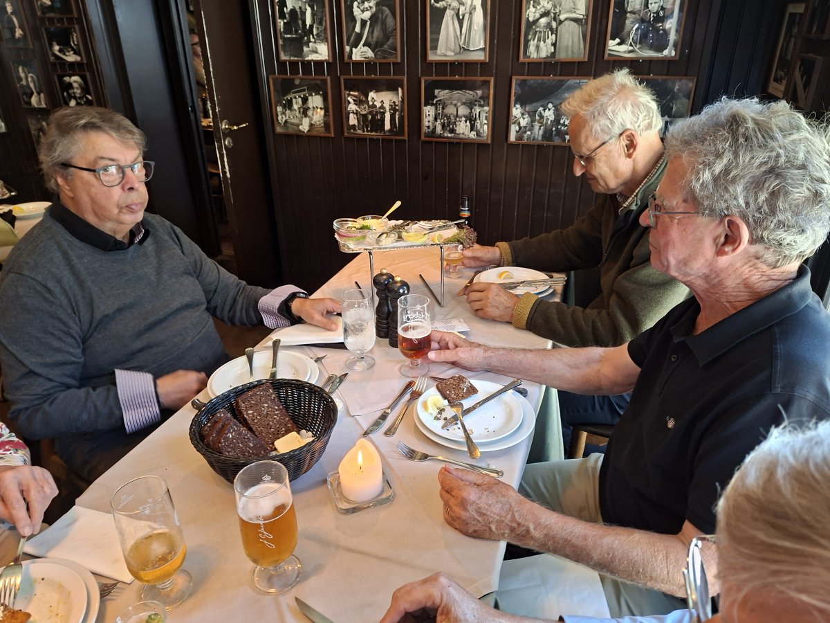 Efter sejlturen, kl. ca. 14, spiser vi frokost på et sted i nærheden. Per Lysdal er i gang med at undersøge markedet, og vi vil forsøge at få en aftale med Teater Bodega, som siden 1908 har ligget ved siden af Aarhus Teater, dvs. lige over gaden fra DOKK1. Som de fleste af os vil huske, er restaurantens vægge dækket med hundredvis af signerede fotografier af dansk teaters største navne, scenebilleder og plakater. Et helt lille museum. Og maden er god.