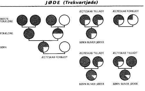 Nedenstående overskuelige diagrammer, som jeg har hentet fra vores førende naziforsker, Karl Christian Lammers "Vejen til Auschwitz", Gyldendal, 2000, viser systemets absurditet. Det menes, at selv de tyske bureaukrater kunne have problemer med at finde ud af, hvem der var jøde - og i givet fald hvor meget jøde?