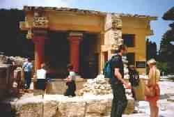 Paladset er delt i en østfløj og en vestfløj af den centrale gårdsplads. De besøgende kommer ind gennem vestfløjen, som rummer de religiøse og officielle værelser, mens østfløjen indeholder beboelses- og arbejdsrum. Denne indgang er den oprindelige ceremonielle indgang til paladset, som jo også tjente religiøse formål. I vestgården findes 3 store gruber, som menes at have været anvendt til offergaver. På billedet til højre står Birgit ved den nordlige indgang - studerer hun kortet for at finde et rygerum? Jeg må indrømme, at som så meget andet på Knossos så er de smukke søjler rekonstruerede. Evans rekonstruktioner var - og er - meget omstridte. Men for lægfolk forhøjer de i hvert fald oplevelsen betydeligt.