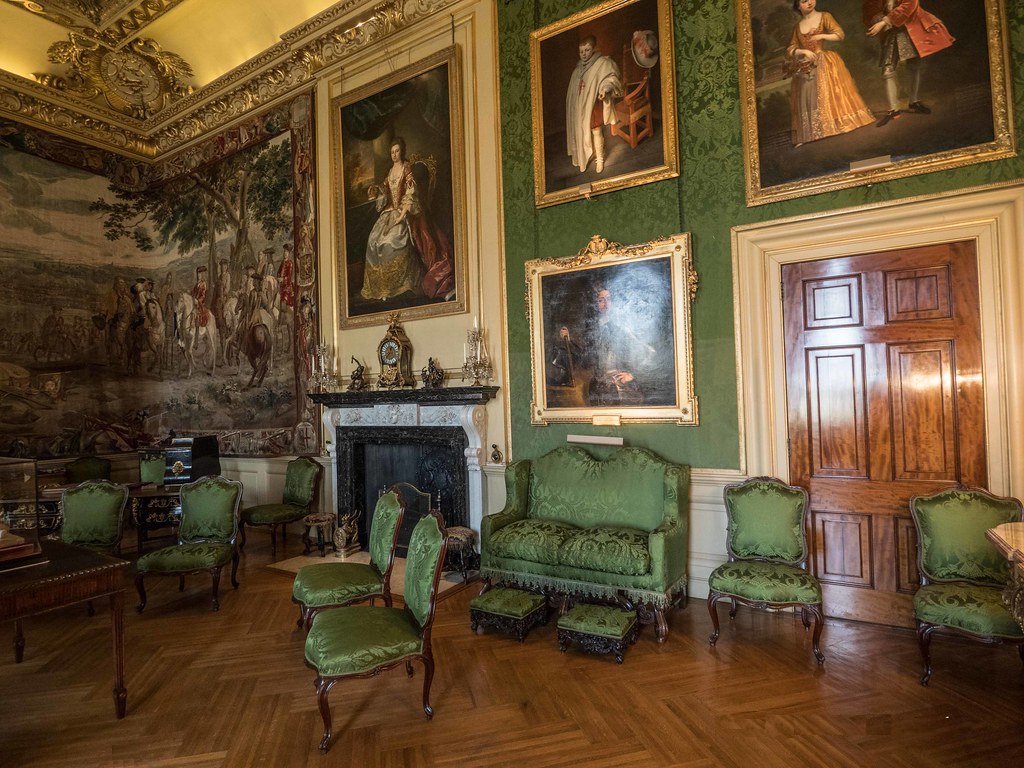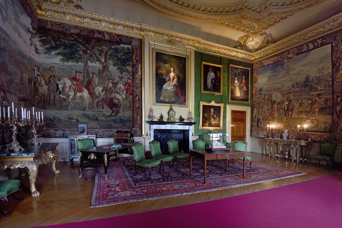 Væggene i "det grønne kontor" er - ikke helt overraskende - beklædt med grønne tapeter og næsten dækket med familieportrætter. Gobelinen viser scener fra slagene ved Dunnewert, Lisle og Malplaquet. Loftet er udført af Nicholas Hawksmoor (1661 –1736).