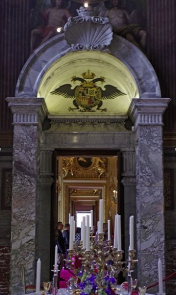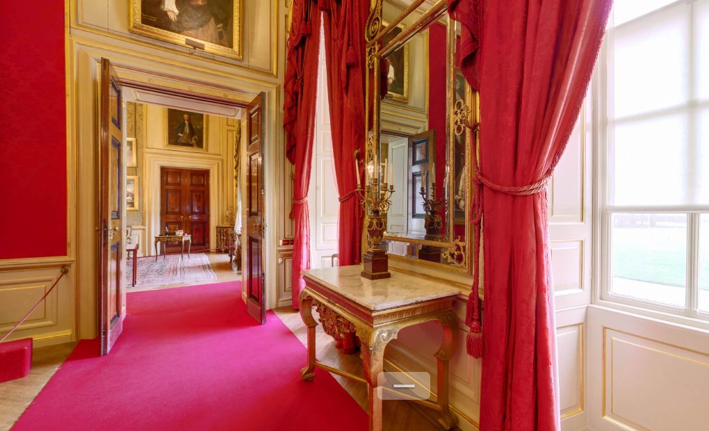 Loftet skulle have været udsmykket af Thornhill, men, som du ved, kom han på kant med hertuginden, så kun de to loftskupler er udsmykket. Paladset, og ikke mindst biblioteket, er udsmykket med utallige værdifulde kunstgenstande. Nogle er givet til hertugen, mange er beslaglagt som krigsbytte.