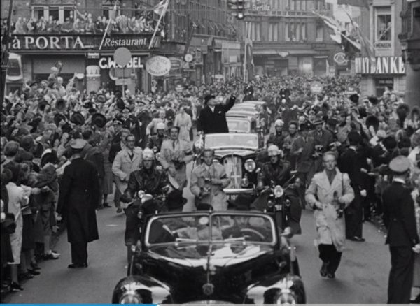 "Jeg har fået mange og strålende modtagelser i Europas befriede lande, men jeg er aldrig blevet så dybt grebet som i København", sagde en tydelig rørt Churchill, da han blev tiljublet af hundredtusinde mennesker på Rådhuspladsen i København, og de fik hans berømte V-tegn – for “Victory” – som tak.