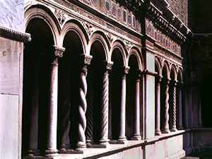 Off the left transept of the basilica one finds an exquisite 13th century cloister, the masterpiece of Jacapo and Pietro Vassalletto (c.1220-36) and a magnificent example of Cosametesque Art. The columns, some plain and some twisted, are adorned with mosaics and have varied capitols. Many fragments from the Constantinian basilica are displayed around the cloister walls.
