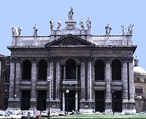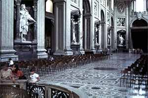 Then we entered San Giovanni, which in fact still is the cathedral of Rome (we also believed, that it was San Pietro). After his victory over Maxentius in 312 AD and the Edict of Milan of 313, which proclaimed Christianity the official religion of the Empire, Constantine donated the basilica to the African pope Melchiades (311-314 AD). In addition, Constantine donated the adjacent (right) domus ecclesiae, which became the Lateran palace and remained the official residence of the popes until their return from Avignon in 1377, at which time the popes took up residence at the Vatican. Still considered the 'the mother and head of all churches of the city and the world', the Lateran remains the official cathedral of Rome. The facade was designed and built by Alessandro Galilei in 1734-36 and consists of a two-storied portico surmounted by an attic with 16 colossal statues of Christ with Apostles and saints. The pope - who is bishop in San Giovanni - gives his benediction from the central loggia on Maundy Thursday (The Thursday of Holy Week). Beneath the portico, the bronze central doors were taken from the Curia (Senate) in the Roman Forum. Like several other churches in Rome there is a special door, only to be used every 25 years - in the so called Holy Year.