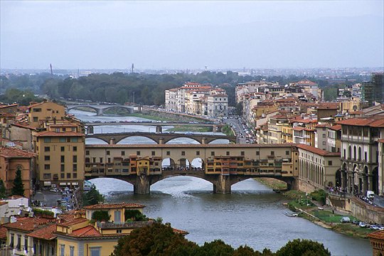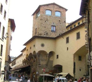 Bare fem minutters gang fra "Piazza delle Signoria" ligger "Ponte Vecchio" ("Den gamle Bro") er den ældste og bedst kendte bro over Arno i Firenze. Den første udgave, som var en træbro, blev formentlig bygget omkring år 50 BC ved flodens smalleste sted, hvor den romerske koloni Florentia lå. Broen blev adskillige gange fejet bort ved oversvømmelser, men hver gang genopbygget. Broen fik sin nuværende placering i 1178, da en stor oversvømmelse fjernede den eksisterende bro, som var fra 800-tallet. Den nye bro havde fem buer, men var kun halvt så bred som den nuværende. Genopførelsen blev finansieret ved udlejning af butikker (43), som blev opført på broen. Indtil 1218, hvor "Ponte alla Carraia" blev bygget, var den den eneste forbindelse over Arno. I 1333 ødelagde en voldsom oversvømmelse både "Ponte Vecchio" og "Ponte alla Carraia". "Ponte alla Carraia" blev genopført fra 1334-1337, muligvis efter design af Giotto. "Ponte Vecchio" blev genopført i 1345, denne gang i sten. Bygmesteren var Taddeo Gaddi (Taddeo di Gaddo Gaddi 1300-1366). Gaddi var søn af mosaikkunstneren Gaddi di Zanobi og gudsøn af Giotto, som han arbejdede sammen med i 24 år. Udover at være en anerkendt maler med mange værker i Firenze, Pisa, Arezzo og Pistoia, var han altså også en dygtig arkitekt og bygmester. Broen består af 3 buesegmenter. Hovedbuen spænder ca 30 meter, mens de to sidebuer spænder 27 meter. "Ponte Vecchio" er den første bro i vesten, som er opført i sektioner. Oversvømmelsen i 1333 havde også fjernet rytterstatuen af Mars, der stod som beskytter af byen. Der er vel således ikke noget at sige til, at florentinerne i stedet rejste en statue af Johannes Døberen.