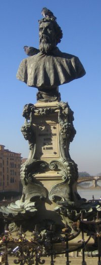 Midt på broen, hvor der er en åbning til begge, er der en udkigsplads. Her står en buste af Firenzes mest berømte guldsmed, Benvenuto Cellini - samme Cellini, som lavede den imponerende statue af Perseus i Palazzo Vecchio.