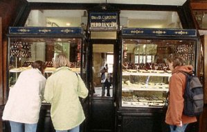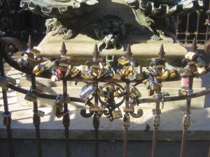 Vi undrede os over betydningen af flere hundrede hængelåse, der var fastgjort til rækværket omkring Cellinis buste. Jeg læste senere, at det er en lokal tradition at unge elskende skriver deres navne på en lås, fastlåser den til dette rækværk og kaster nøglen i Arno fra Ponte Vecchio. Dette skulle medføre, at deres kærlighed vil holde for evigt. Vi så denne skik praktiseret flere steder i byen, bl.a. ved vildsvinet på Mercato Nuovo. Jeg har dog også læst, at byen regelmæssigt lader disse låse fjerne med en boltsaks - noget af et ansvar man derved påtager sig. (Jeg kan betro, at Birgit og jeg nu har været gift i mere end 42 år uden brug af den slags hjælpemidler. Selv om vi var i Firenze i november måned, hvor der ikke er mange turister, var broen dog fyldt med sådanne. Hertil kom et stort opbud af gadekunstnere, kunststuderende og protrætmalere. En god oplevelse.