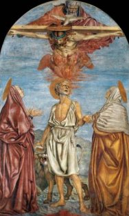Indenfor til venstre ligger et lille marmorkapel udført af Michelozzo til ære for den underfulde freske med "Jomfru Marias bebudelse". Desværre så vi ikke fresken, da denne kun vises for offentligheden på Marias bebudelsesdag (den 25. marts - 9 måneder før Jesu fødselsdag). Jeg har læst, at billedet med de mirakuløse egenskaber er restaureret så mange gange, at det efterhånden er umuligt at se detaljerne på det. Det er en gammel tradition i Firenze, at nygifte brude tager til Annunziata kirken umiddelbart efter deres bryllup og anbringer deres brudebuket her foran Madonna. Tabernaklet er behængt med hundreder af votivlamper, så det minder mest om et græsk kapel. I et kapel på venstre side er en fresko af St Jerome og to helgener, som tilbeder Treenigheden, udført af Andrea del Castagno (ca 1453). Som det ofte er tilfældet, afbildes Jerome sammen med en løve, en henvisning til en legende, som beretter, at Jerome engang fjernede en torn fra dens pote. Jesus er vist på korset, og Helligånden fremtræder i form af en hvid due. Andre af kapellerne indeholder fresker af Andrea del Castagno. Desværre så jeg det ikke selv, men jeg har læst, at der på tabernaklet er denne inskription: "Costo fior. 4 mila el marmo solo", "alene marmoret kostede fire tusinde floriner". Det er formentlig den gamle Cosimo, som lige ville gøre opmærksom på, at det ikke er gratis at støtte hverken kunsten eller kirken.