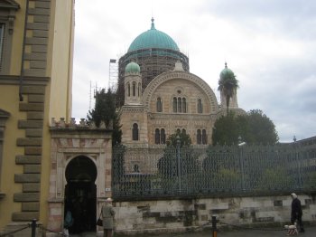 Inden vi kom til Firenze, havde vi læst, at den havde en imponerende synagoge, hvorfor vi havde sat den på vores program. Også fordi vi aldrig havde været i en synagoge, mens vi har besøgt masser af kristne og muslimske kirker. Synagogen ligger i udkanten af den historiske bydel i Via Farina, men ikke længere væk, end vi med lethed kunne spadsere derhen. Vi undrede os lidt over, at der ikke var skilte, der viste til synagogen, idet der var masser af skilte til byens øvrige seværdigheder. Da vi kom frem til synagogen, havde den netop lukket for turister, så vi spadserede lidt længere hen ad Via Farini, hvor der ligger en dejlig park. Her sad vi en halv time på en bænk og kiggede på de legende unger. Vi vendte tilbage til synagogen et par dage senere, men da der jo ikke er nogen grund til, at du også skal fjolle rundt, får du åbningstiderne her: