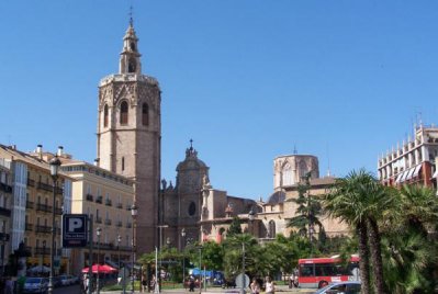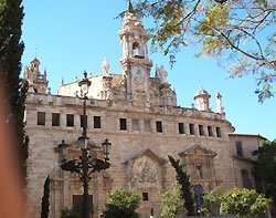 Her på pladsen ligger to af byens vigtigste kirker. Til venstre på billedet ser du "Basilica de Virgen de Los Desamparados", "Jomfruen for de fortabtes basilika", som er den næstvigtigste religiøse bygning i Valencia efter katedralen. Til højre ses katedralen, som vi kommer til om et øjeblik. Basilikaen er en af de første barokbygninger i Spanien, opført i traditionel stil med blå kakler på kuplen. Den er opført fra 1352-1367 og er forbundet med katedralen via en prægtig renæssance buegang fra 1357.
