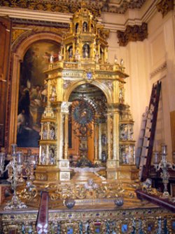 I tværskibet hænger en lampe fra 1300-tallet. De højtsiddende vinduer er nærmest glasseret med tynde skiver af alabast, som lige netop lader lyset skinne ind. Vi så også en monstrans på 2300 kg, lavet af guld, sølv og juveler. Monstransen bæres gennem byens gader på de religiøse festdage.