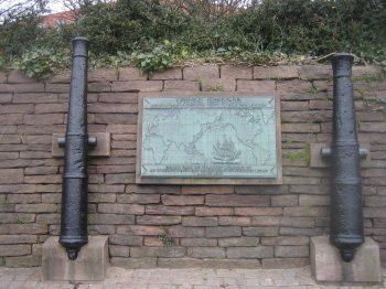 Efter besøget i museet fortalte den meget venlige og særdeles vidende "kontrollør" os, hvorledes vi kunne finde Vitus Bering Parken. Efter en dejlig spadseretur, som bragte os forbi mange af byens smukke gamle bygninger, nåede vi parken, som indeholder et monument over bysbarnet Vitus Bering. Monumenter fra 1957 er et verdenskort i smukt patineret kobber, hvorpå Berings to store ekspeditioner er markeret. Kortet flankeres af to originale kanoner fra Berings flagskib "St. Peter. Kanonerne er, som du kan se, en gave fra USSR.