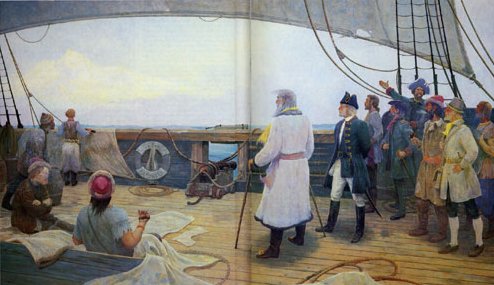 Mandskabet udgør 44 mand, heriblandt en foged, to kosakker, ni soldater, seks tjenere, en trommeslager og to tolke. Efter en forberedelse på næsten tre år og omkring 9.000 km gennem nogle af jordens mest øde og besværlige egne, har Bering nu endelig dæk under fødderne og sejler ud for at gøre sin lykke. Landet ser meget ugæstfrit ud fra søen, og de høje forrevne sneklædte bjerge kan ses de første 100 sømil. Den 17. juli lægger tågebankerne sig tæt om skibet, og siden sætter regnen ind. Da de kommer til bækkenet ved Anadyr, Østasiens nordligste flod med udløb i Stillehavet, går Peter Chaplin i land med nogle folk for at finde ferskvand. Desværre er der intet vand at finde. Et par dage senere bliver Chaplin igen sendt i land, og denne gang kommer han tilbage med 22 tønder drikkevand. Da han kommer ombord, fortæller han, at han har set en hytte af store knogler dækket med skind. Hytten har været brugt for nylig, og der er fodspor omkring den. Spændingen breder sig på skibet, thi alle ved, at den indfødte befolkning er særdeles krigerisk, og selv de tapre kosakker frygter dem.