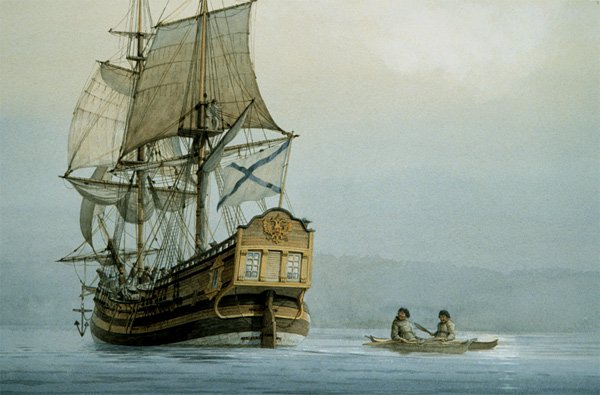 Derfor er stemningen anspændt, da man næste morgen observerer en skindbåd med otte mand, som ror ud til skibet fra kysten. Den er den 8. august 1728, og positionen er 64°30' nordlig bredde. En af eskimoerne (inuitterne) tager nogle oppustede sælblærer op fra bunden af båden og binder dem omkring sig, lader sig glide ned i vandet og svømmer over til skibet. Han kommer ombord og fortæller med hjælp af skibets tolk, at lidt nordligere drejer landet skarpt vestpå. Han beretter også, at de snart vil få en stor ø i sigte. Det er det første dokumenterede møde med de indfødte på den amerikanske nordkyst.