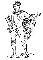 Apollon, som er søn af Zeus og Leto, har en tvillingsøster, Artemis. Du har sikkert tidligere på denne side læst, hvorledes den jaloux Hera søger at hindre Leto i at føde sine børn. Hun sender bl.a. slanen eller dragen Python for at dræbe Leto. Da han kun er nogle få dage gammel, går Apollon til sin fader Zeus og beder om en gylden bue, hvorefter han dræber Python, som har efterstræbt hans moder. Gaia, som er moder til Phyton, bliver vred og forlanger Apollon straffet, men Apollon klarer frisag ved at kalde præstinden ved det hellige tempel i Delfi for "Pythia", hvilket i nogen grad formilder Gaia. Apollons træ er laurbærtræet og hans fugl kragen. Han afbildes ofte med en laurbærkrans på hovedet.