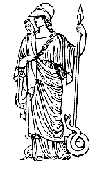 Athene er datter af Zeus. "Hm, der må da være en moder også?", tænker du nok. Men Zeus sluger Metis (visdommens gudinde), som er hans første hustru, før hun nedkommer med Athene. Han er blevet spået, at Metis vil føde et barn, som vil gøre ham rangen stridig. Derfor bliver Zeus selv gravid, og da han skal føde, får han en uudholdelig hovedpine, og Hefaistos må kløve hans pande med en økse, og ud springer Athene fuldt bevæbnet. Hun er Zeus' yndlingsdatter, og han lader hende ofte låne sit skjold og sit mest frygtede våben, tordenkilen. Hun hjælper Zeus i kampen mod Titanerne, og viser stort mod. I modsætning til Ares kæmper hun altid med omtanke, og hun foretrækker den kølige strategiske planlægning frem for den sanseløse blodrus i kampen. Athene er gudinde for byen og civilisationen, og byen Athen bærer hendes navn. Du husker måske, at hun slog den mægtige Poseidon i en konkurrence om, hvem der skulle være byens beskytter? Athene er også visdommens gudinde, på en gang krigerisk og fredelig, jomfruelig og moderlig, og hun lærer kvinderne at spinde, væve og malke. Hun er også kendt som beskytter af slotsherrerne i Mykene, som kalder hende Pallas Athene. Hun bærer tilnavnet "Parthenos", som betyder jomfru, og hendes tempel på Akropolis hedder af samme grund "Parthenon". Hun har en forkærlighed for flere af de antikke helte som Odysseus, Akilleus og især Perseus, som hun hjælper med råd. Hun er den eneste af guderne, som kløgt kan måle sig med Zeus.