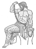 Hefaistos er søn af Zeus og Hera. Han bliver født som krøbling, hvorfor Hera smider ham ned fra Olympen i afsky. Han falder heldigvis i en sø, hvor han bliver samlet op af havgudinden Thetis, som opfostrer ham. Han er smedenes gud og en af de mest elskede af guderne; han er retfærdig, hjælpsom og har i det hele taget mange dyder, man kan savne hos faderen Zeus og de andre guder. På trods af sit åbenbare handicap - han er lammet i benene - er Hefaistos gift med den skønneste af gudinderne, Afrodite. Som du har hørt, er det ikke noget lykkeligt ægteskab, da Afrodite er ham utro med Ares, men nok om det. Hefaistos har sin smedje under jorden, nogle mener nede i Etna på Sicilien. På trods af sine gode egenskaber vil Hefaistos hævne sig på Hera, og han sender hende en smuk stol, som han har fremstillet. Hera sætter sig i stolen, og der må hun blive siddende, indtil Hefaistos kommer og udfrier hende. Mbedst er han kendt for fremstilling af våben. Fx laver han et skjold til helten Herakles. Da Akilleus under den trojanske krig har foræret sine våben til vennen Patrokles, går hans moder Thetis til Hefaistos, som hun jo har opfostret, og beder ham om at lave en rustning til Akilleus. Og Hefaistos smeder det berømte skjold, fuld af billeder som beskrevet i Iliadens 18. sang, som intet våben kan gennemtrænge. Herefter smeder han en rustning, der skinner klarere end ild, en solid hjelm med en dusk af guldtråde samt et par benskinner af tin.