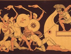 Undervejs lander grækerne på den lille ø Tenedos, hvorfra man kan se Troja. Her bringer man et offer til Apollon, den store bueskytte. Offeret bringes af Filoktetes, som har fået Herakles bue og pile som tak for at have ydet ham hjælp. En slange snor sig frem fra alteret og bider Filoktetes i foden. Der går betændelse i såret, og ingen salve hjælper. Smerterne er så store, at hans skrig kan høres over hele øen. Det ender med, at Agamemnon giver Odysseus ordre til at sætte Filoktetes i land på Lemnos, hvor han opretholder livet ved at skyde fugle. (Måske kender du Nicolai Abildgaards billede af "Den sårede Filoktet", der hænger på Statens Museum for Kunst?). Der skal komme en dag, hvor grækerne vil savne den store bueskytte.