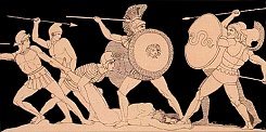 Akilles' nære ven (og elsker) Patroklos mener, at det er tid at gribe ind, men Akilles nægter fortsat at vende tilbage til kampen. Hektor beder Akilles om tilladelse til at låne hans gyldne rustning og lede myrmidonerne i kamp, hvilket han får tilladelse til. Gamle Nestor havde fået det indfald at lade Patroklos vise sig på slagmarked iført Akilles' rustning, hvilket helt sikkert ville indgyde skræk i trojanerne. Det lykkes Patroklos at afværge den umiddelbare fare for, at de græske skibe skal blive taget, og Patroklos dræber en af trojanernes allierede, Sarpedon, som er en (dødelig) søn af Zeus. Trojanerne viger. Patroklos bliver overmodig og vil løbe storm på Troja, men han såres af Euphorbos, hvorefter Hektor dræber ham, tager Akilles' våben og ifører sig Akilles' rustning. Der bliver heftig kamp om den faldne Patroklos. Det ender dog med, at Menelaos og Meriones bærer Patroklos legeme til den græske lejr, medens de to Ajax'er slår fjendens angreb tilbage.