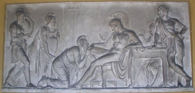 Guder forfærdes også over Akilles' mishandling af Hektors døde legeme, og de beslutter, at kong Priamos skal have sin søns lig udleveret, og Thetis overbringer dette budskab til sin søn. Samtidig får den gamle kong Priamos af Iris besked på at gå til Akilles' telt med rige gaver og bede ham udlevere sønnens lig. Priamos ankommer i følge med Hermes, og Akilles forbarmer sig over den gamle konge, der beder om lov til at give sin søn en passende begravelse. Priamos og Akilles sørger sammen over deres tab, hvorefter Priamos vender tilbage til Troja med Hektors døde legeme.