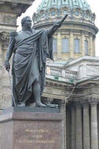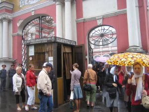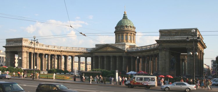 Længere nede ad Nevsky Prospekt kom vi til den imponerende Kazan Katedral. Vi havde på Den Røde Plads i Moskva besøgt en Katedral med samme navn; begge er viet til "Den hellige jomfru af Kazan", som er en ikon, der kom til Rusland fra Konstantinopel engang i 1200-tallet. Du har måske læst historien om ikonens forunderlige historie på min Moskva-side? Efter at den mirakuløse ikon havde hjulpet Rusland mod Napoleon i 1812, lod tsaren ikonen flytte til St. Petersborg i 1821, hvor den blev anbragt i den lokale Kazan Katedral, som var blevet færdig i 1811. På den tid var der omkring 10 kopier af den undergørende ikon forskellige steder i Rusland. Petersborg-ikonen forsvandt under revolutionen i 1917, men dukkede op igen under anden verdenskrig, hvor den blev ført i procession omkring på byens forsvarsværker. Tilsyneladende hjalp det, da det som bekandt ikke lykkedes nazisterne at indtage byen.