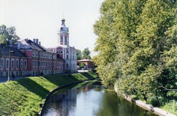 Indgangen går gennem en elegant bue, som er en del af en kirke , bygget fra 1783-1785. På hver side af vejen er mure ind til klostrets berømte kirkegårde. Mere om dem senere. Herefter skal vi over en lille bro, inden vi kommer ind på klosterområdet. Ved vores sidste besøg sad omkring en snes uniformerede veteraner fra Ruslands krig i Afghanistan og tiggede penge. De fleste havde mange dekorationer - men manglede til gengæld arme og/eller ben. Mange blev kørt derud om morgenen for at blive afhentet senere. Et sørgeligt syn; jeg ved ikke, hvad der er blevet af disse ulykkelige krigsofre, men de har formentlig fået forbud mod at genere turisterne, kunne jeg tænke mig.