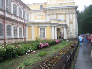 På venstre side ligger Bebudelseskirken (Tserkov Blagovescheniya), som stadig er under renovering. Den rød-hvide kirke, som blev bygget af Domenico Trezzini fra 1717-1722, huser i dag byens skulpturmuseum med modeller af mange af byens arkitektoniske seværdigheder. I kirken er begravet mange fremtrædende personligheder fra 1700-tallet, blandt disse general Alexander Suvorov, som ledte den russiske hær til sejr i den tyrkisk-russiske krig fra 1768-1774. Overfor kirken ligger en kiosk, som især sælger religiøse souvenirs. Priserne forekom lavere end udenfor klostret, måske fordi mange af køberne er russere?