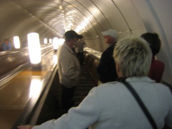Hver halve time kørte der en shuttlebus mellem skibet og Proletarskaya metrostation, som ligger på den grønne linie. Metroen i St. Petersborg har fire linier: rød, gul, grøn og blå. Pris for en polet i 2007 var 14 rubler svarende til ca. 3 danske kroner. Du kan køre ubegrænset længe på én polet og stige om så tit, du lyster og orker - altså ingen zoner og ingen tidsbegrænsning. Systemet er nemt at bruge, og der er udmærket skiltning, som dog kun er med russiske (kyrilliske) bogstaver ;-). Den største udfordring er at komme med toget i den rigtige retning. Vi prøvede en enkelt gang at køre galt, men hoppede bare af ved næste station og kørte tilbage.